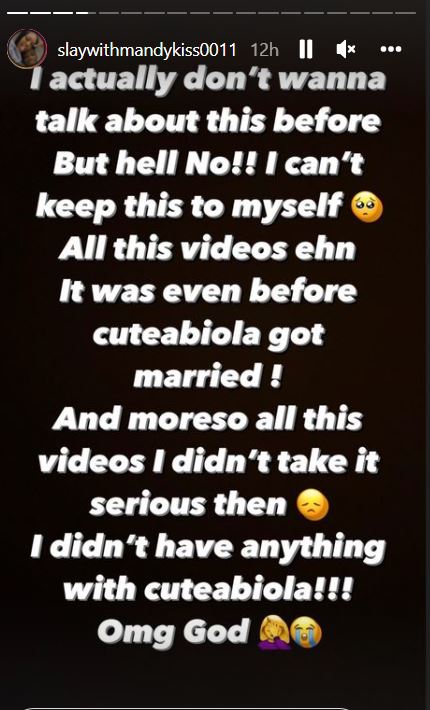 “I actually don’t wanna talk about this before but hell No!! I cant keep this to myself. All this videos ehn it was before cuteabiola got married! And more so all these videos I didn’t take it serious then. I don’t have anything with Cuteabiola omg God”. She wrote.