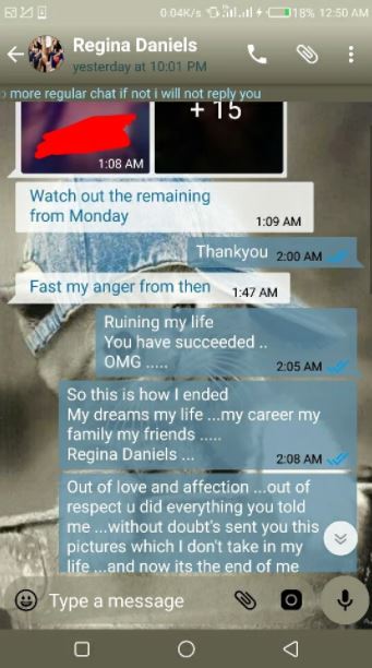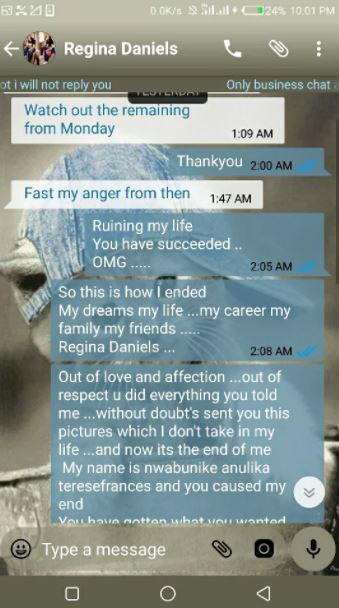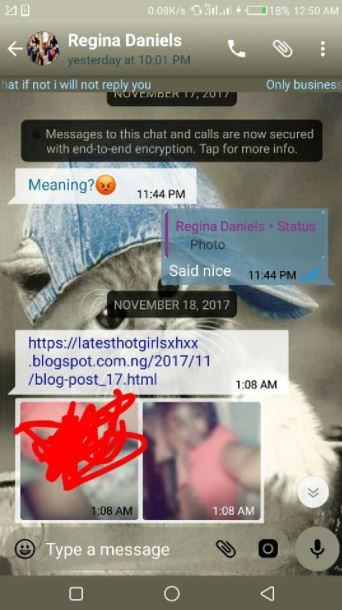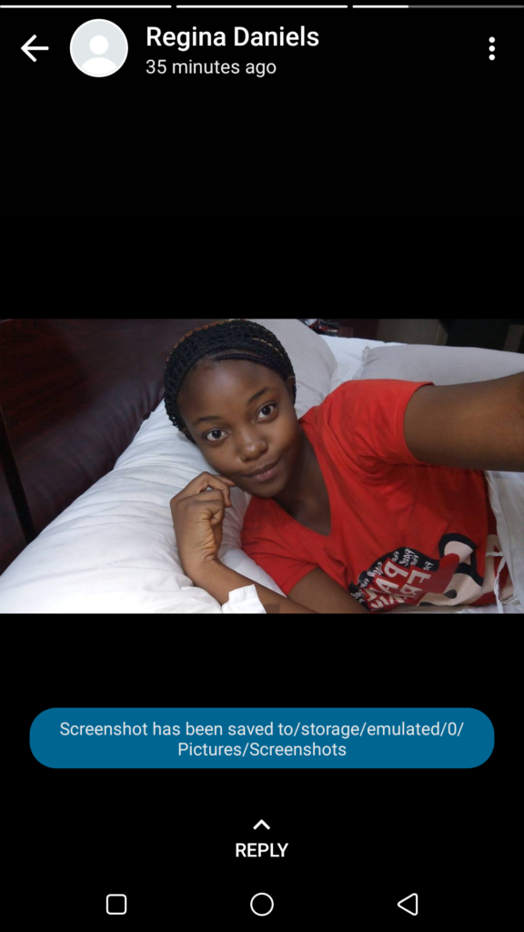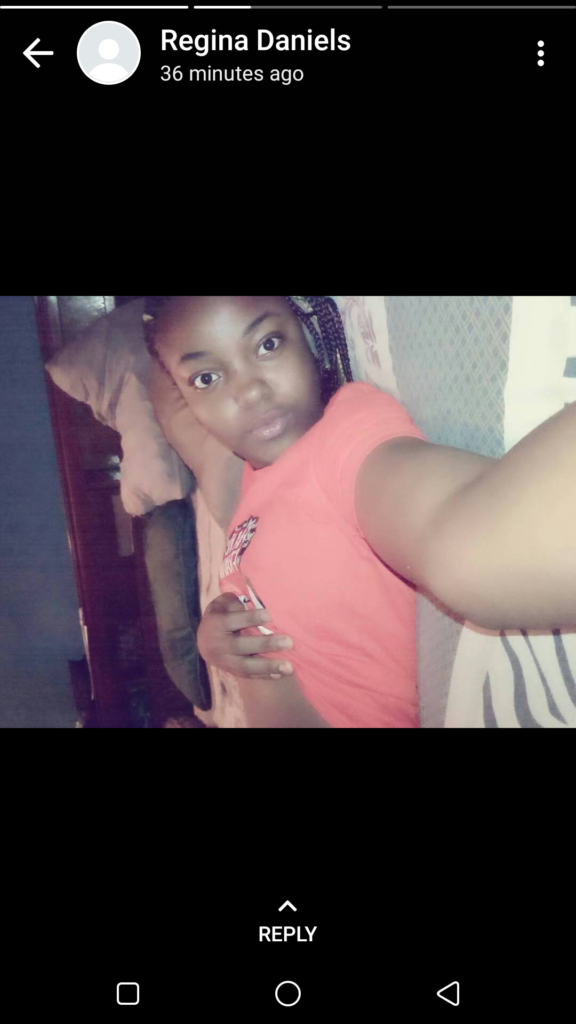 “My name is frances I joined a group ,a networking online business named jamalife helpers global .. Through the advert by Regina Daniels brother Sammy Daniels . I met Regina in the group chat And I started chatting her At first she didn’t pay attention but I really wanted help with getting into acting….finally she started responding and I assumed she wanted to help me [ I did and she uploaded it to her fan page….