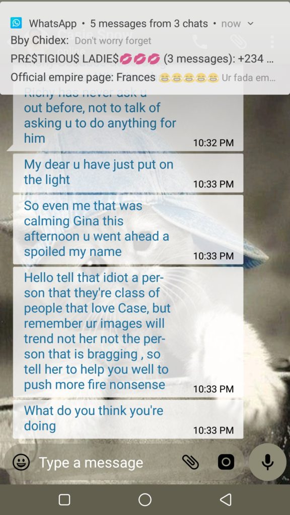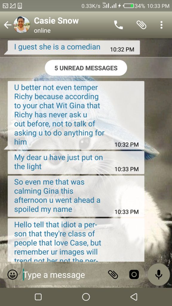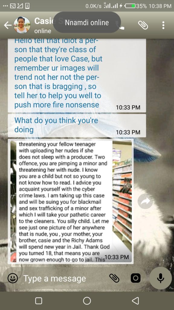 i sent her the nudes and she started treating me like a friend….she asked me to meet up with Richy Adams, I did at a public place n I went with a friend He didn’t tell me anything about getting intimate with him during this meeting He’s supposed to be a movie producer After that meeting, Regina was angry with me for not offering myself to Richy on d basics that he loved me n was going to help me become a star She blocked me on WhatsApp n her brother chatted me up….