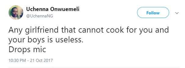 A Nigerian guy on Twitter, Uchenna Onwuemeli has taken to the platform, to air his thoughts on how relationships should be – he says a lady is real if she’ll cook for a guy, his friends and even his dogs.