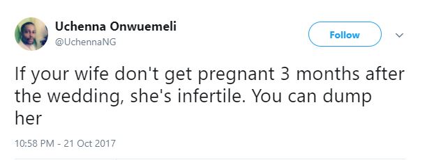 @UchennaNG shared on Twitter that if one’s wife doesn’t get pregnant the first three months after the wedding, then the man can dump her cause she’s infertile.