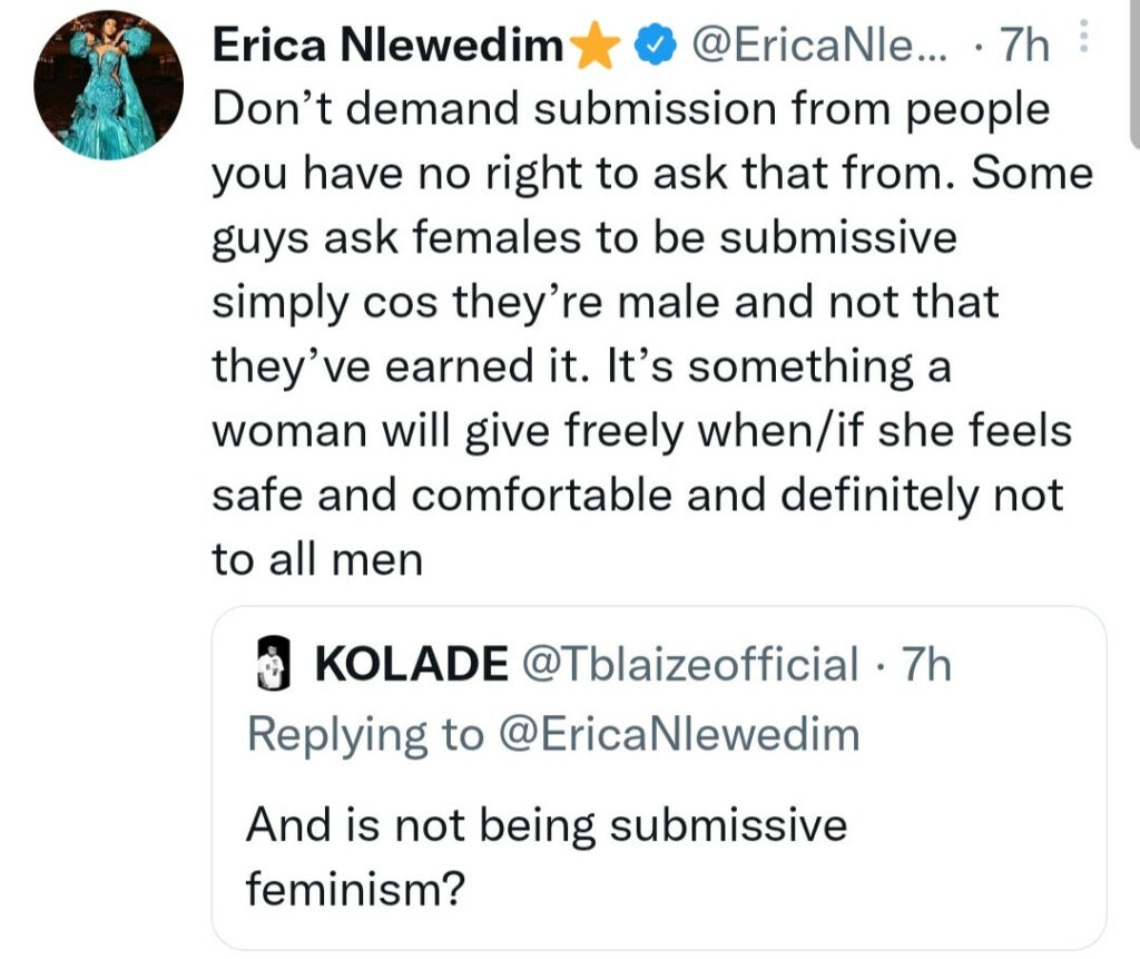 Reality TV star and actress, Erica Nlewedim has declared herself a feminist and revealed the only reason why she would submit to a man.