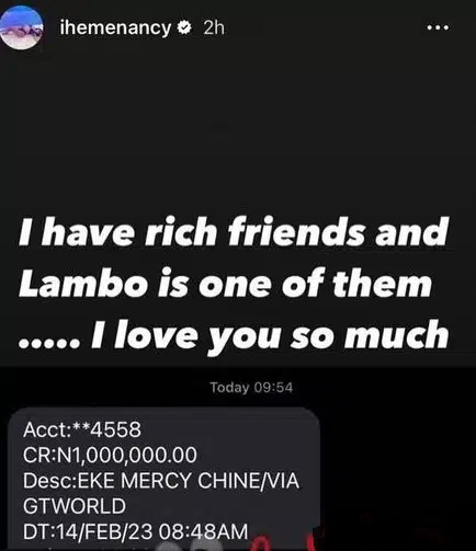 Mercy Eke gifted Nancy a whopping one million naira for Valentine’s, and the actress, giddy with excitement, shared the receipt of the credit alert on Instagram.
