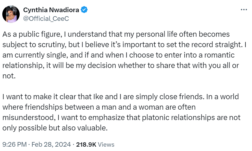 I want to make it clear that Ike and I are simply close friends. In a world where friendships between a man and a woman are often misunderstood, I want to emphasize that platonic relationships are not only possible but also valuable.”