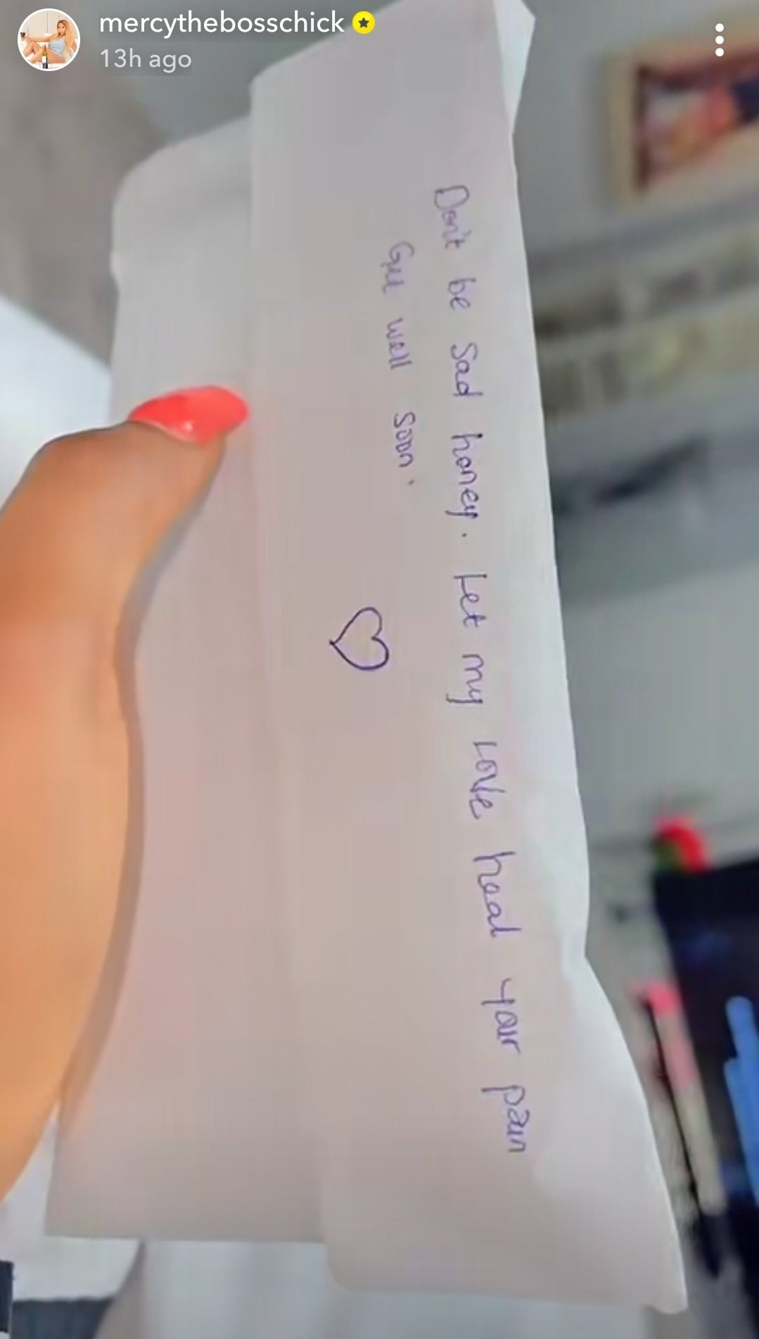 It reads, “Don’t be sad honey. Let my love heal your pain. Get well soon”