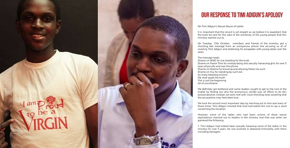 Mine teenage ministry has faulted the public apology of its coordinator, Timi Adigun after he was accused of sexually assaulting a number of the teens in his care.