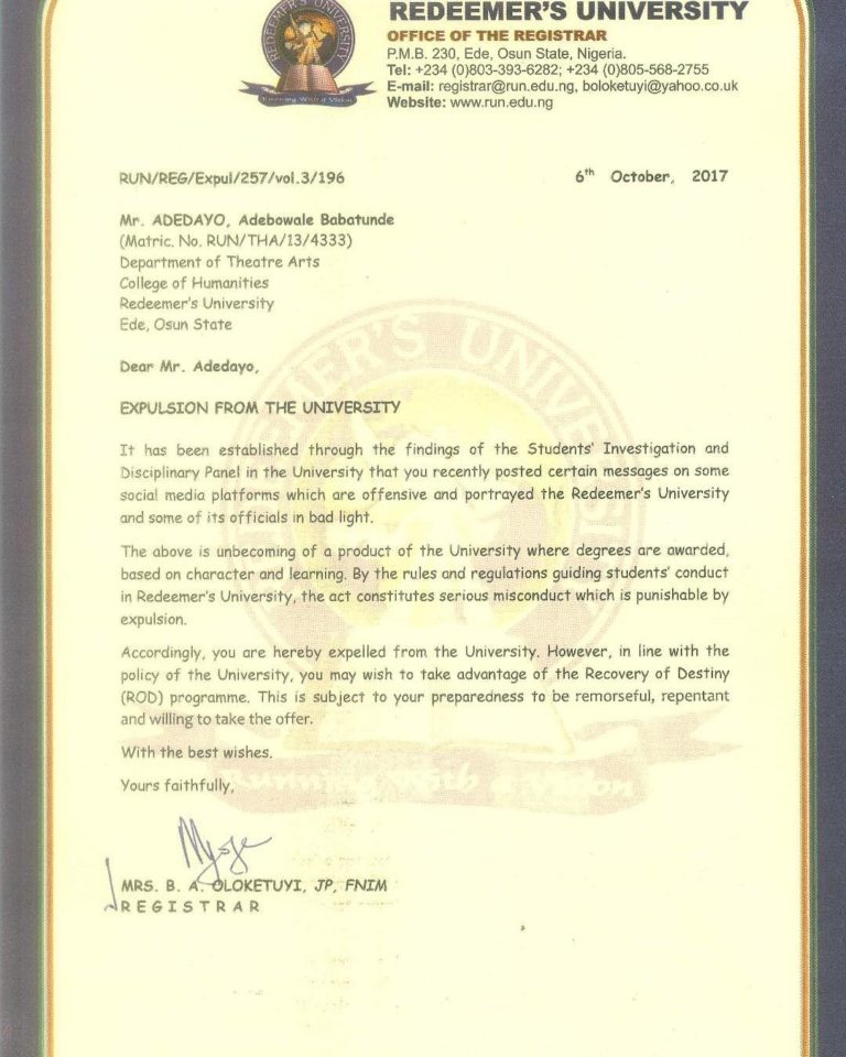 In all my posts, I never mentioned the name of the University nor the name of any of her official. Yet on the 12th of this month, I received a letter of Expulsion for this supposed reason. I have been patient enough with the management of the University.
