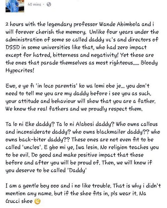 I posted this after a meeting with Prof Wande Abimbola. The school mgt invited me for an ‘interaction’ and right there, I was told that the school mgt feels that this post is about them.