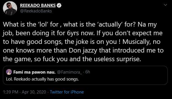 Obviously disgusted by the tweet, Reekado Banks resorted to coming for the guy by telling him that making good music is what he’s about and he’s been doing it for six years now.