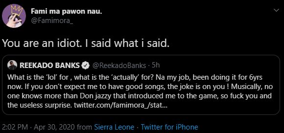 @Famimora_ —possibly a man of few words— then responded by plainly calling the singer “an idiot” and stood by what he said. Following Reekado’s flare as regards the inceptive tweet, Twitter users have had mixed reactions to the whole saga.