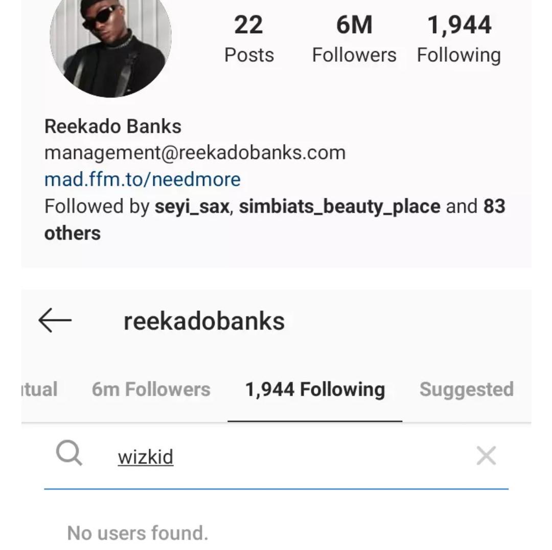 Popular Nigerian singer, Reekado Banks has unfollowed Wizkid on Instagram, few days after the star boy blasted him on Twitter.