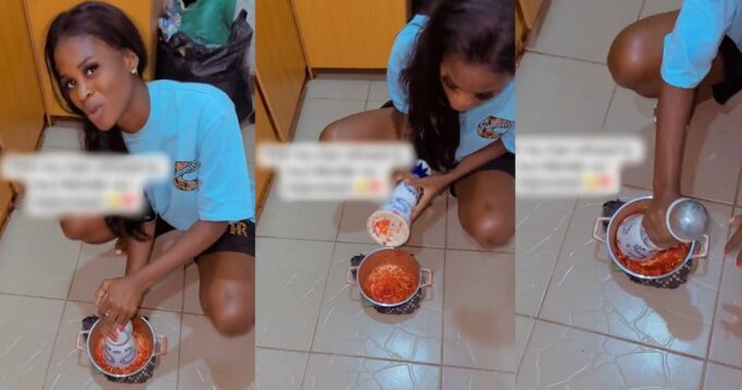 A Nigerian lady has stunned many internet users including her partner after she was captured blending pepper with an Azul bottle.