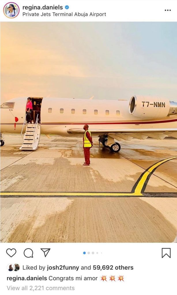 Nollywood Actress, Regina Daniels has congratulated her Billionaire Husband, Ned Nwoko on his latest acquisition, as he acquires a Private Jet.