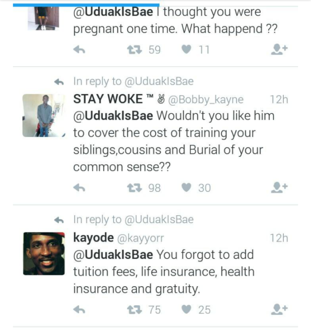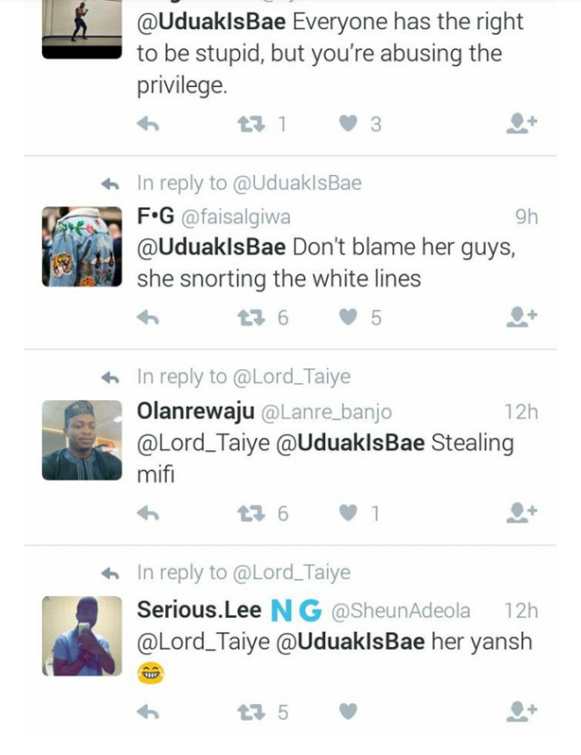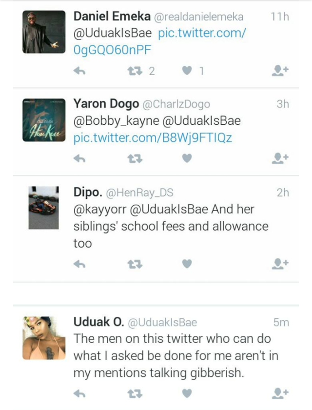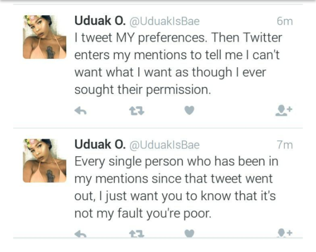 Nigerian Twitter user, Uduak O., who alongside her friend recently got trailed by National Drug Law Enforcement Agency, NDLEA, over cocaine usage and WiFi stealing, shared her opinion on what she expects in a relationship.