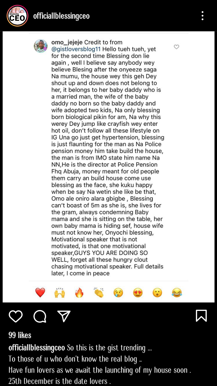 However, as fans anticipate the unveiling of the new house, Instagram blogger, Gistlovers, called Blessing Okoro out, accusing her of deceiving the public for the second time.