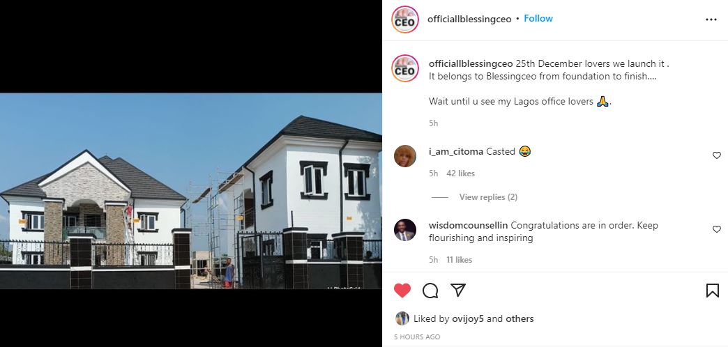 Reacting to the allegation, Blessing Okoro took to her Instagram page to reiterate that the house, which she’s set to launch on Christmas Day, December 25, belongs to her.