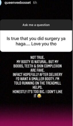 In an interactive Questions and Answers (Q&A) in August 2021, Vera who claimed that her massive derrière was entirely real, stated that her other features, such as her breast, teeth, and skin tone, are not natural.