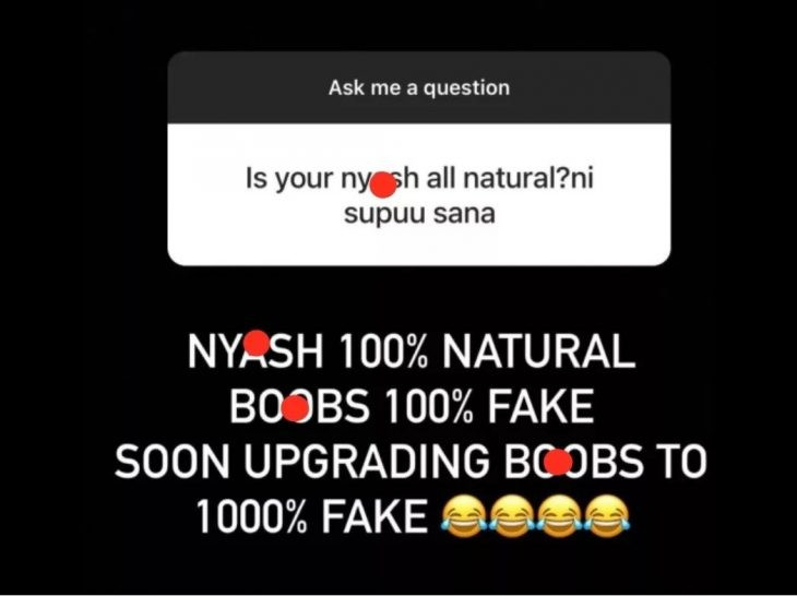 In other post, she added, “Nyash 100% natural boobs 100% fake soon upgrading boobs to 10005 fake”.