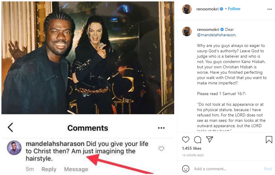 Reacting to this, Reno called the man out for questioning his hairstyle and stated that Nigerian Christians are worse than Kano Hisbah.