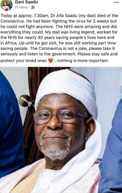 “A very sad day for UK doctors as one of the brightest, kindest and most respected stalwarts of Nigerian doctors in the UK, Dr Alfa Saadu has just died after volunteering to help in the wards and caught the bug. He came off the ventilator this morning.