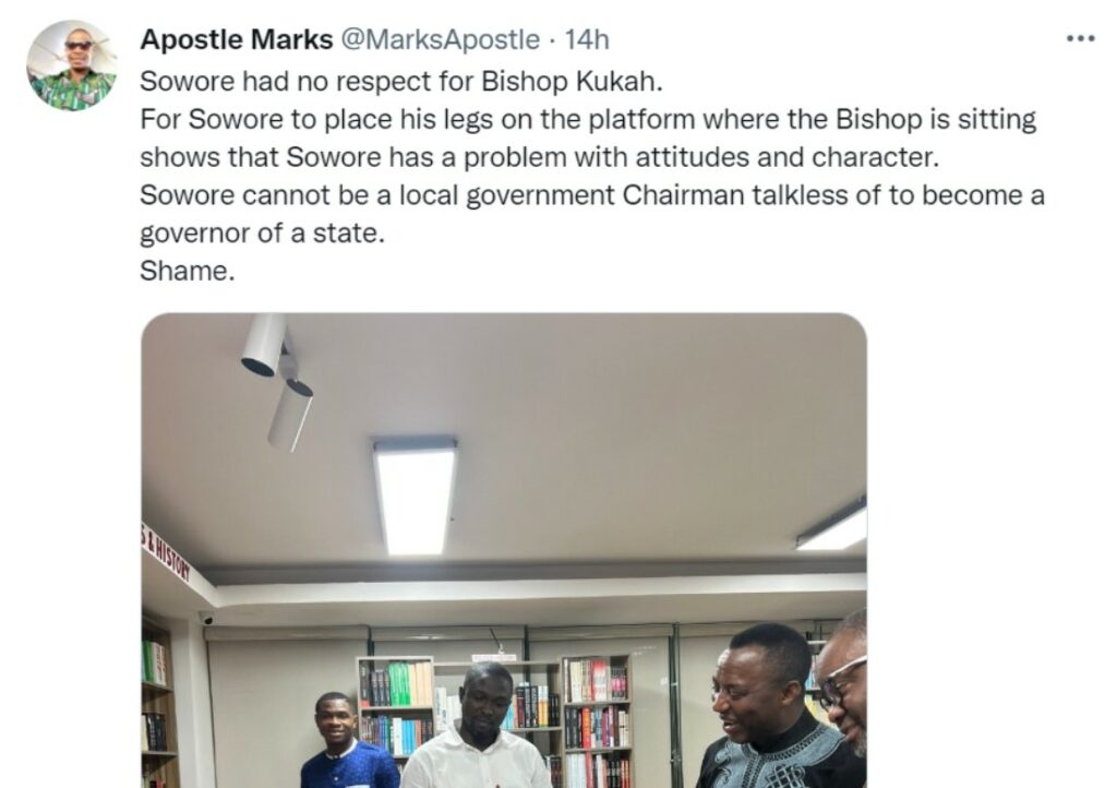 A Twitter user has lampooned Nigerian politician and activist, Omoyele Sowore, for placing his leg on a platform where the Catholic Diocese of Sokoto State, Bishop Matthew Kukah, sat on.