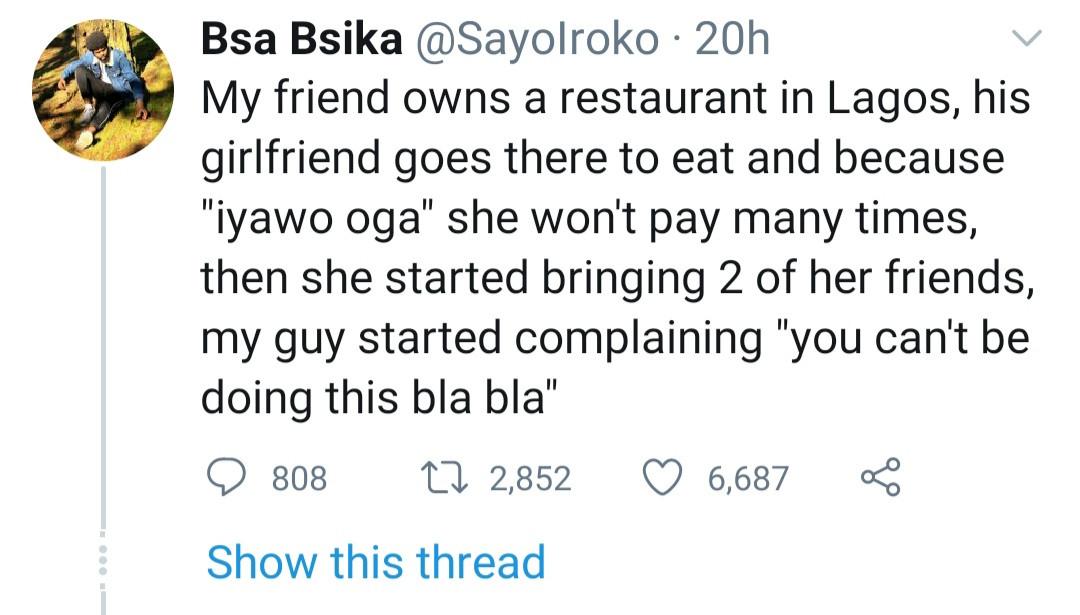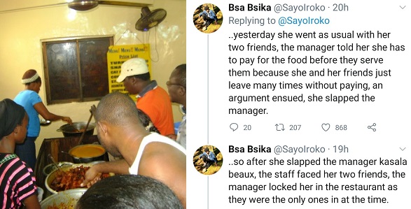 According to the Twitter user, @SayoIroko who shared the story on the platform, that was not the first time the owner’s girlfriend would walk into the restaurant, eat and not pay.
