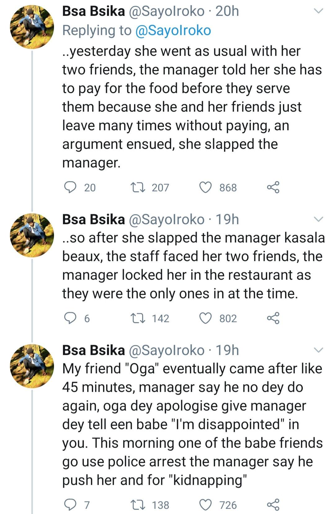 The manager of a popular restaurant in Lagos was allegedly slapped and arrested for insisting the owners girlfriend and her friends pay for their food.