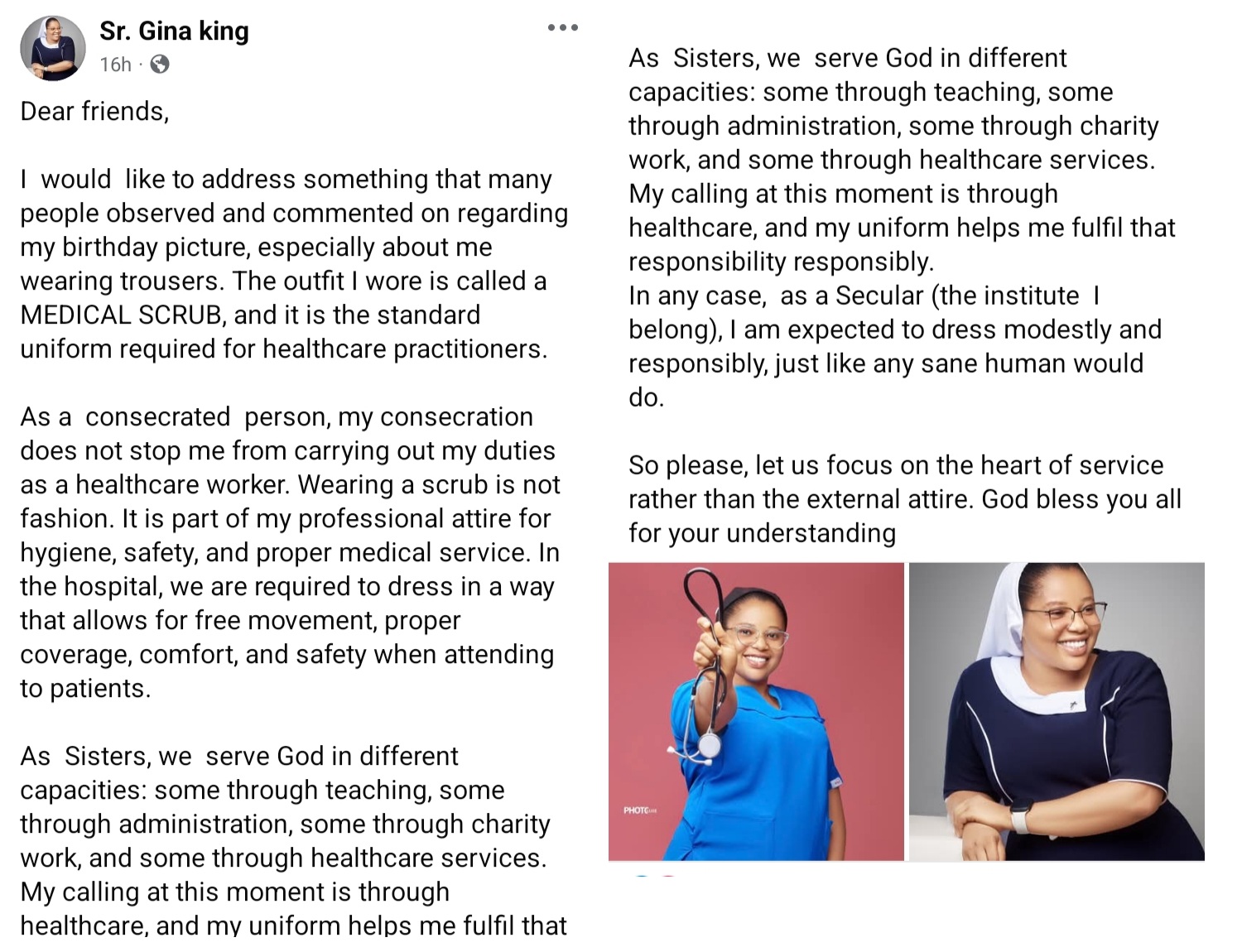 “The outfit I wore is called a medical scrub, and it is the standard uniform required for healthcare practitioners. As a consecrated person, my consecration does not stop me from carrying out my duties as a healthcare worker.” She wrote