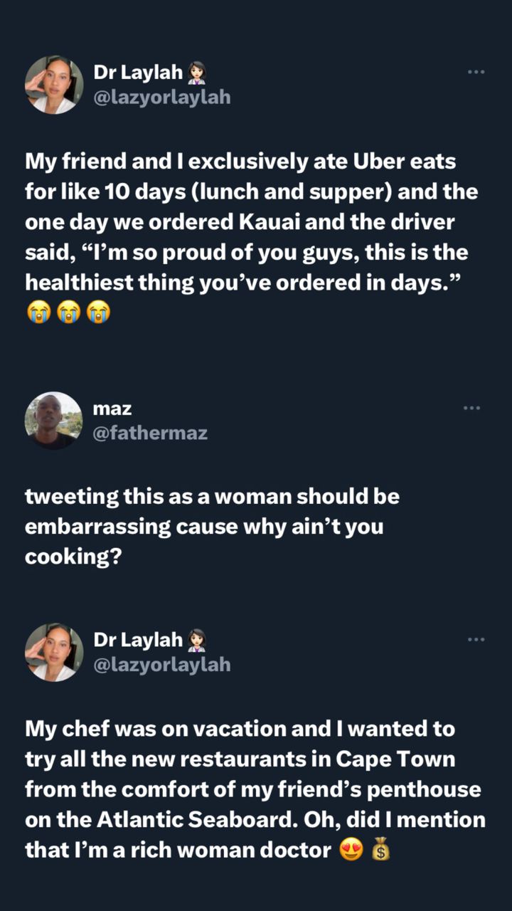 Dr. Laylah responded to him, explaining how her chef had been on vacation and why she decided to try all the new restaurants in Cape Town.