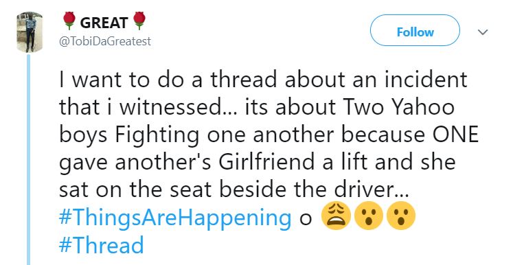 According to the twitter user, the 2 young men came to blows because one of them gave the girlfriend of the other a lift with his car and she sat in front “beside him”, while his own girlfriend sat at the back.