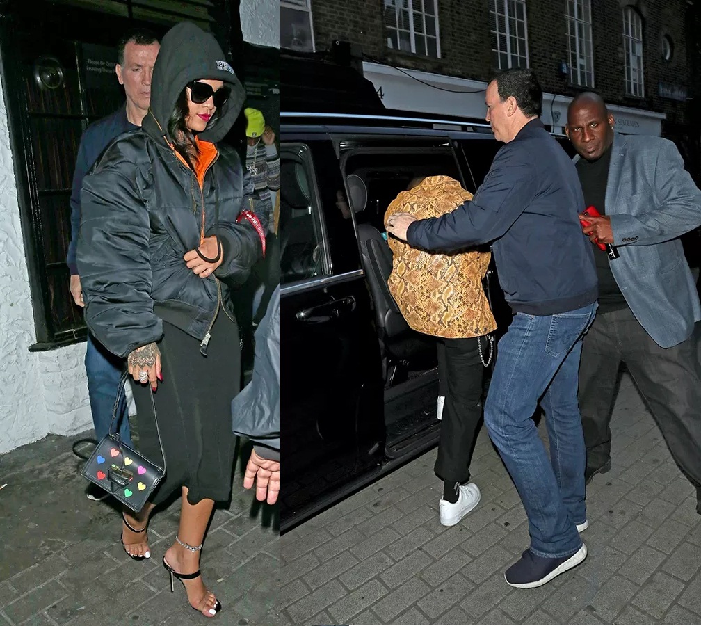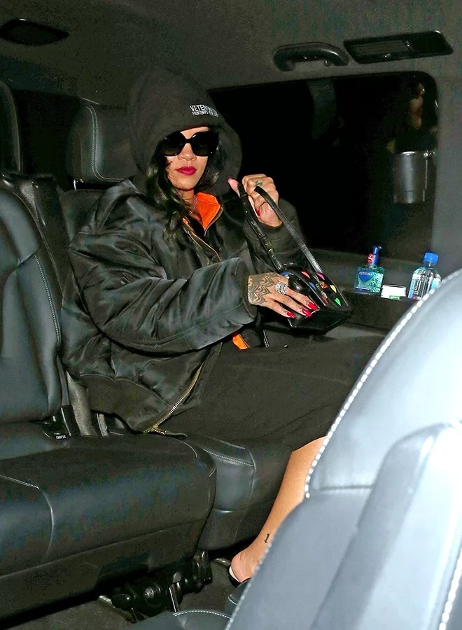 Rihanna left holding a handbag with love hearts on and a unknown male companion was seen getting in to her car before the pair was chauffeur driven off in to the morning.