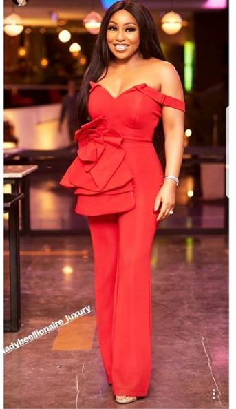 She recently stepped out in a lovely gown and a perfect smile which has been described as the best make-up a woman could wear. Other pictures of her in a red jumpsuit will make any critical mind wonder why she is still single.