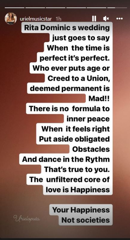 Uriel, reacting to the ceremony in a post shared via her Insta-stories, said that Rita Dominic’s wedding is proof that when the time is perfect, it’s perfect. She noted that getting married has nothing to do with age, so no one should be pressured into settling down.
