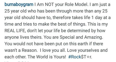 Nigerian dancehall singer Burna Boy, has taken to his social media page to tell those who see him as a role model, to stop seeing him as that, because he is not! He’s just a 25 year old who has been through a lot.