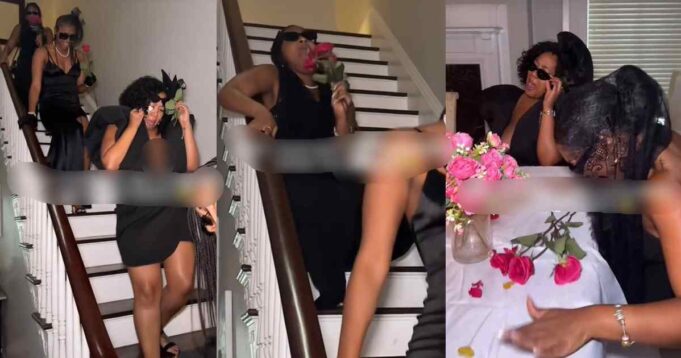 A bridal party has turned heads online as bridesmaids bid the bride’s single life with an unconventional yet elegant “RIP to the Streets” themed shower, donning black attires.