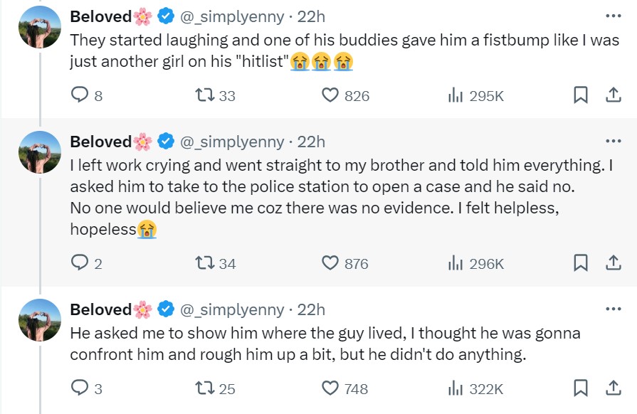 “Until a week later when he showed up at my workplace with his buddies. I was livid They started laughing and one of his buddies gave him a fistbump like I was just another girl on his “hitlist” I left work crying and went straight to my brother and told him everything. I asked him to take to the police station to open a case and he said no. No one would believe me coz there was no evidence. I felt helpless, hopeless He asked me to show him where the guy lived, I thought he was gonna confront him and rough him up a bit, but he didn’t do anything. Until the 31st of December that year, we had a New Year’s Eve braai at home and my brother wasn’t there. We thought maybe he left with his friends to celebrate New Year’s somewhere else. 12 o’clock came, we lit fireworks and gave each other hugs. He came back later and gave me a long hug. Like he was squeezing the life out of me. He looked different, he wasn’t smiling as usual or celebrating. The following day we heard that my rapist was shot and he died.”