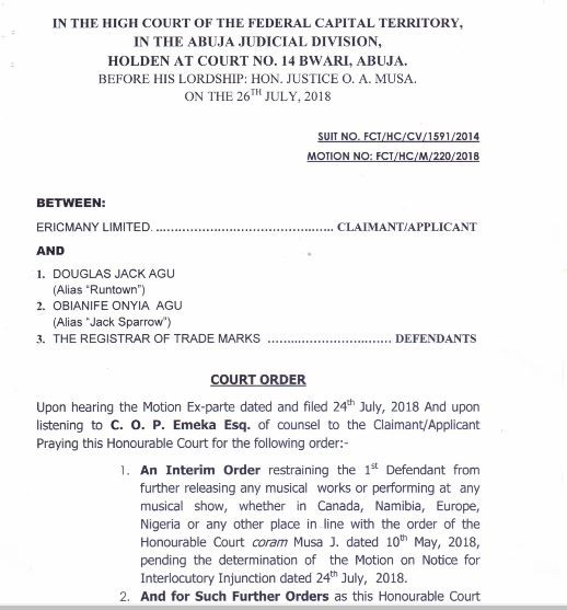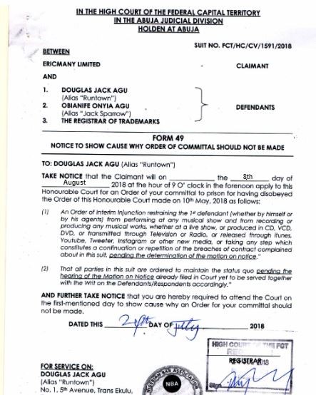 An Abuja High Court has fixed 8th August, 2018 for Runtown to appear and give reasons why he should not be sent to prison for disobeying a Court Injunction made on 10th May, 2018.