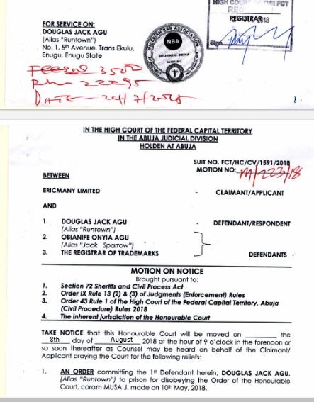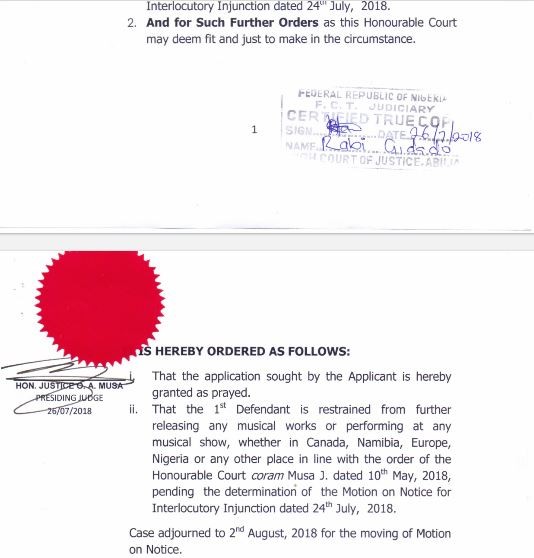 “Based on this, we have done two things: One, we have obtained a ‘FORM 49’ against him to explain why he should not be sent to prison, especially when he continued to publicize fixtures for shows in Canada, Namibia, Europe etc and threaten to release more songs, both actions in defiance of the Court Order. The application (now fixed for 8th August) has been served on him in the Punch as ordered by the Court.