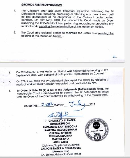 “Recall that we served a Contempt Warning from Court on Runtown on 4th July, 2018 after he defied Court Order and released a song. Rather than heed the Contempt Warning and retrace his steps, he issued a Press Release in which he argued that the Injunction had expired.