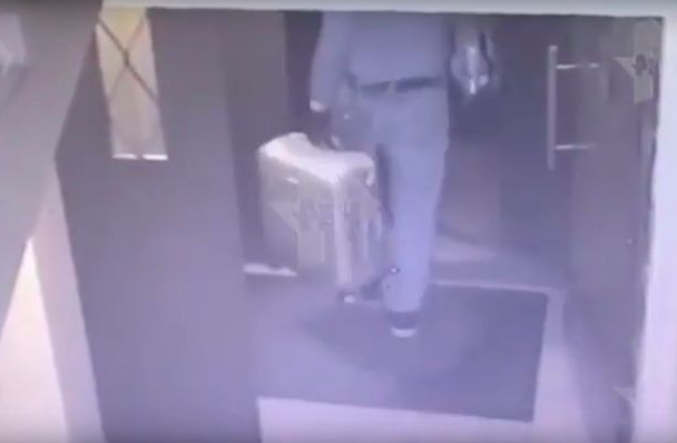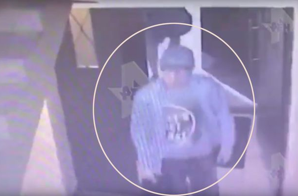 Russian channel REN TV obtained the CCTV footage. In it, the man is seen entering the block of flats with his face hidden by a cap. Four hours later the man left with a smaller suitcase and it is believed that he removed her bloodstained clothes and a weapon used to slit her throat and stab her twice in the chest.