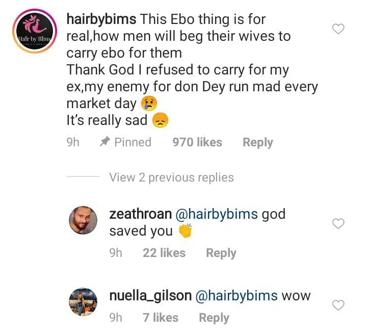 “This Ebo thing is for real, how men will beg their wives to carry ebo for them. Thank God I refused to carry for my ex, my enemy for don dey run mad every market day😢. It’s really sad😞”. She wrote.