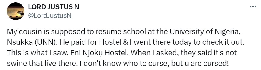 “My cousin is supposed to resume school at the University of Nigeria, Nsukka (UNN). He paid for Hostel & I went there today to check it out. This is what I saw. Eni Njọkụ Hostel. When I asked, they said it’s not swine that live there. I don’t know who to curse, but u are cursed! Lol, let me shock you: when I got there to check the room for my cousin, was locked, while others were opened. When I asked students from the adjacent room, who provided the keys, they said it’s locked because the room was for officials of the Student Union. Meaning it’s the best.”
