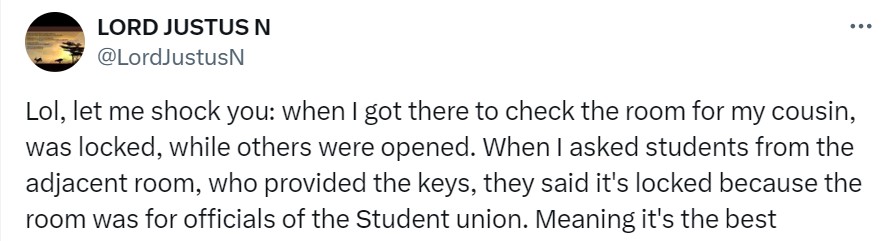He also added that the room was locked when he went to check it out and the student within the premises revealed that they locked the room because it was for officials of the student union.
