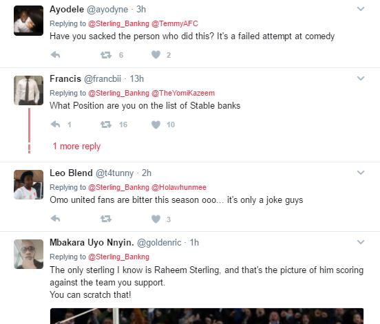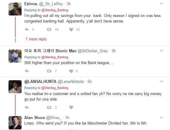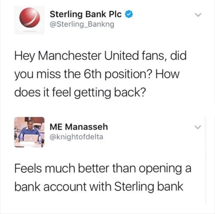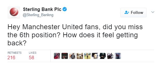 Sterling Bank yesterday, trolled all Manchester United Fans with the tweet: “Hey Manchester United Fans, did you miss the 6th position? How does it feel getting back?”..
