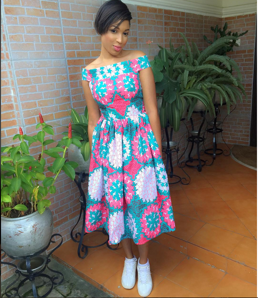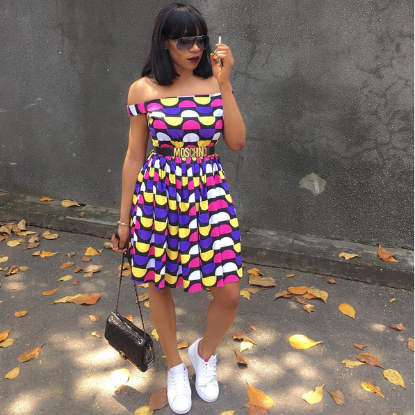 Wife of billionaire Dabota Lawson rocked in this Ankara baby doll dress paired with sneaker; a fashion sense combo, designer, Yvonne Nwosu rocked last month.