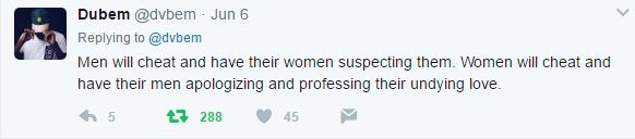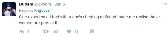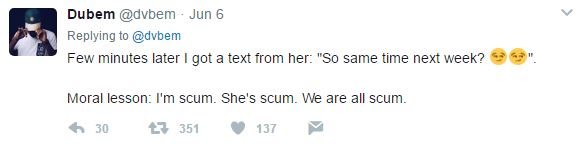 A Nigerian guy, by sharing his own experience, explains why both men and women are scum – Dubem on Twitter took to the platform to share his own experience of how a lady he’d been getting down with is a pro at being a scum.