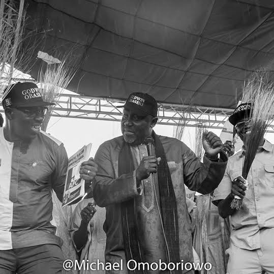 Governor of Edo State Adams Oshiomhole and his stunning wife Iara were both photoed doing the boggy dance at the flag off APC gubernatorial election rally which was held over the weekend.