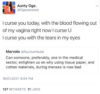 There was serious arguments on menstrual cycle, sanitary pads and use of tissue on Twitter yesterday – in light of the trend, the Twitter user above asked the question and got this very cruel response.