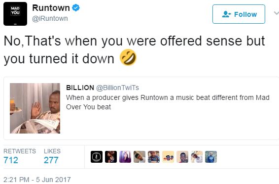 Nigerian singer and songwriter, Douglas Jack Agu betteer known by his stage name, Runtown took a swipe at a Twitter follower who said he has no other beat asides his “Mad Over You” beat.
