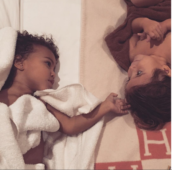 You can’t help but wonder what the duo are conversing. Beautiful daughters of reality TV stars, Kim and Kourtney Kardashian, Penelope Disick and baby fashionista, North West are pictured here looking adorable as they lay together on a bed.